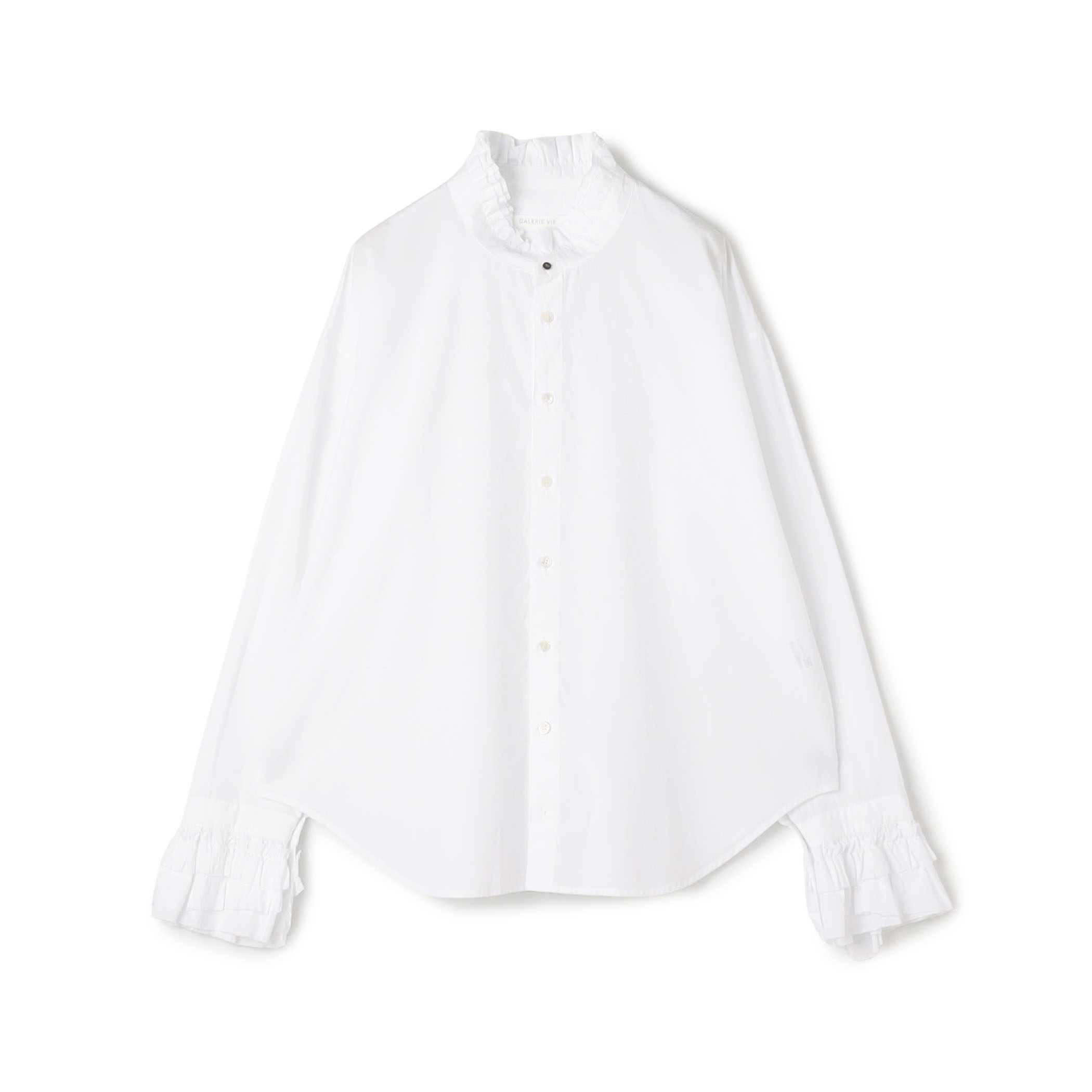 デニムとレイヤードし、GALERIE VIEのフリルのシャツと合わせて、フェミニン×カジュアルなコーディネートにしてみました。