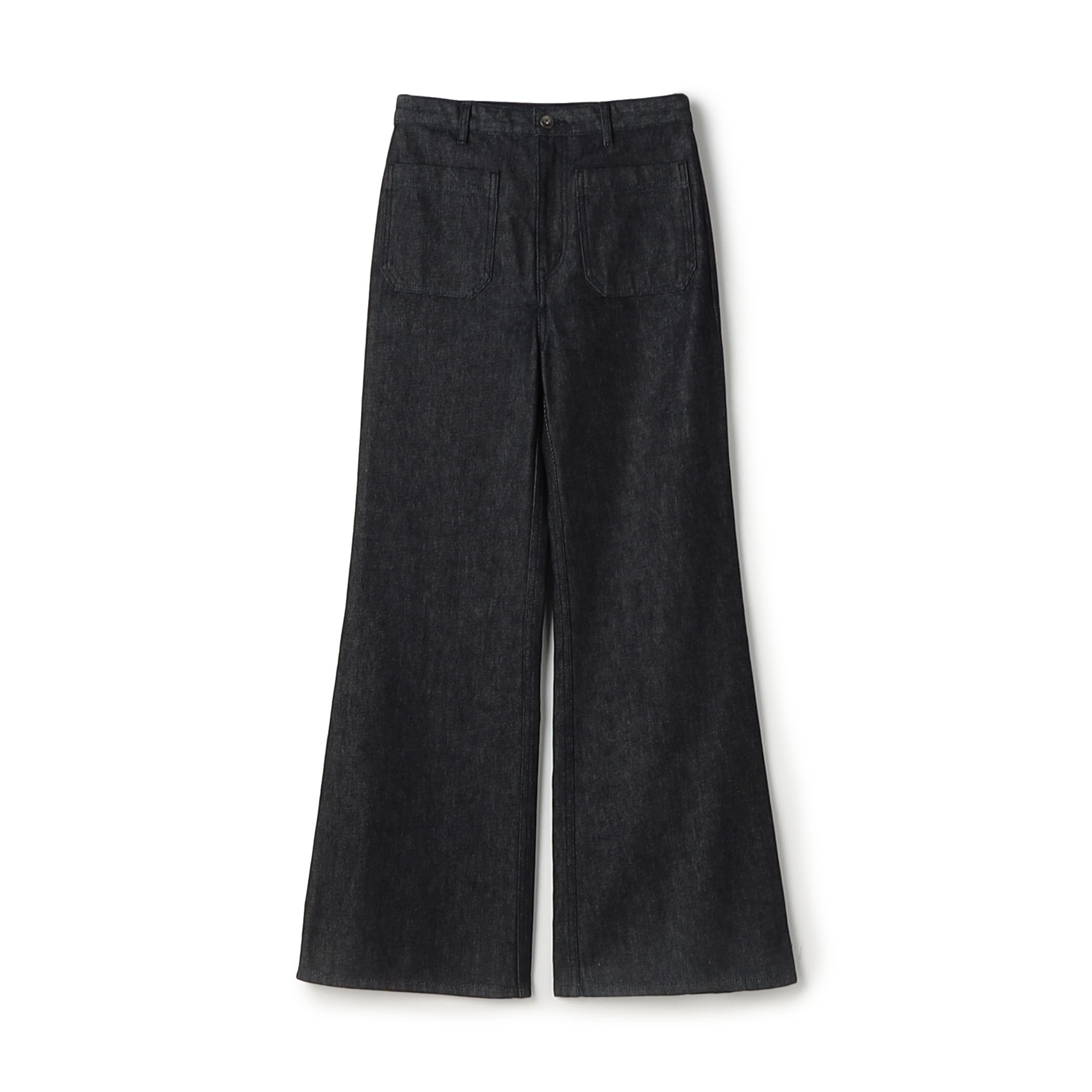 デニムパンツは美しいフレアラインが特徴で、カジュアルすぎないスタイルに仕上がります。
