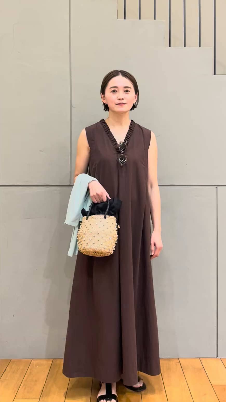 薄いグリーンのカーディガンを色のポイントにしました。