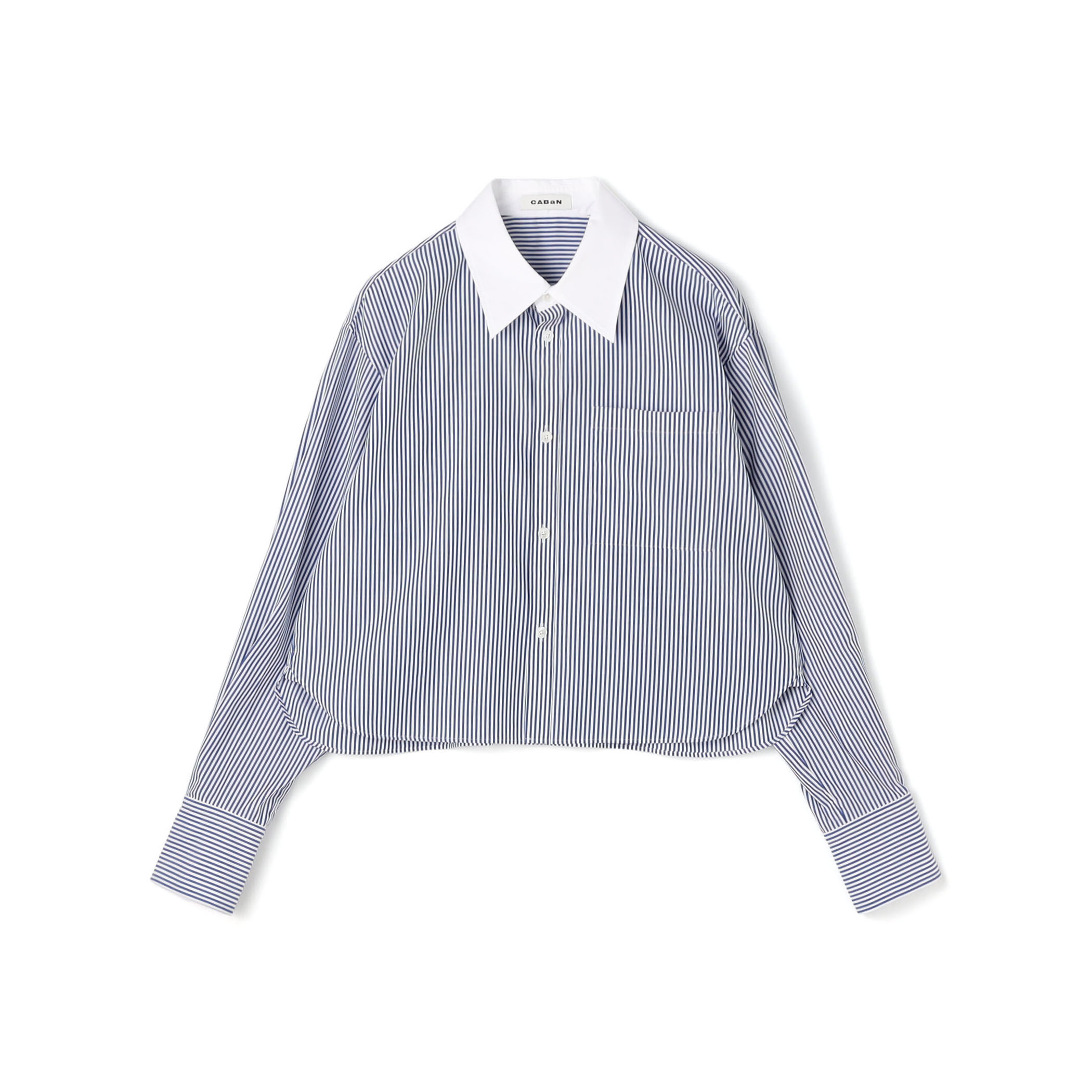ショート丈のレギュラーカラーシャツは、襟とカフス裏を白のクレリックデザインに。