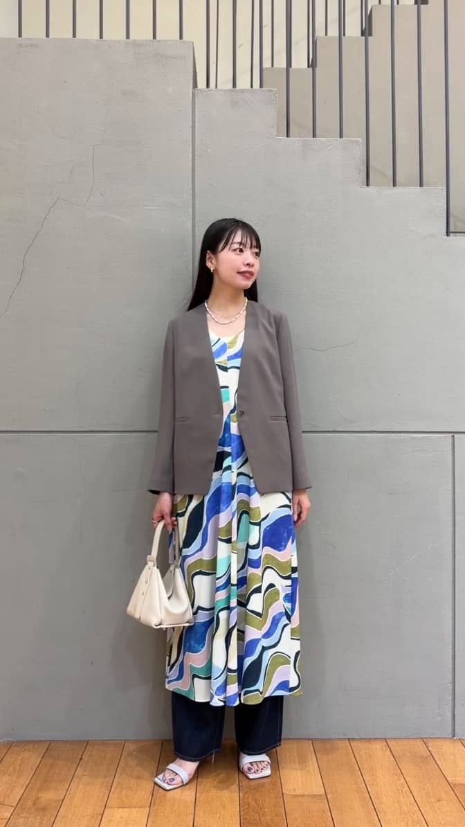 プリント柄が目を惹くワンピースをレイヤードし、綺麗めなカジュアルスタイルにしました。