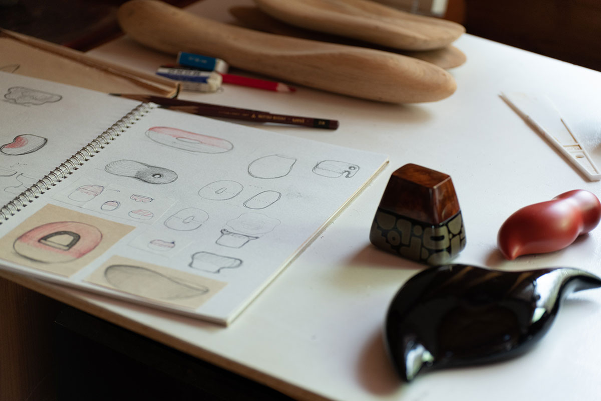 「手で考える」。頭の中でコンセプトをあらかじめ考え、それをかたちにしていくよりも、手にふれながら、かたちを探す。絵をスケッチブックに描き、それを出発点としながらも、粘土などを使って実際に立体にしてみると、平面には描きこまれなかった細部や、連続していく曲面に目が留まる。