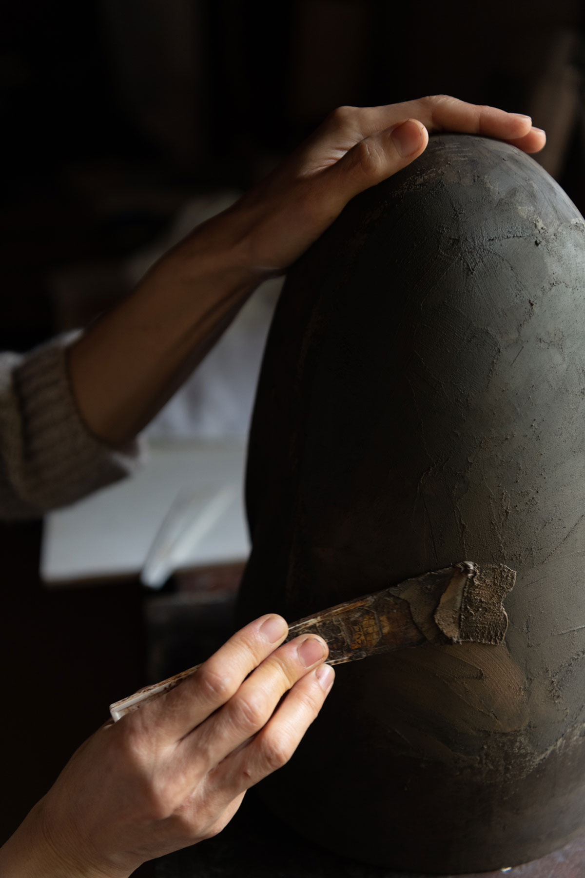 私はあまり言葉で表現することは得意ではないけれど、漆では「心を込める」ということをまさにこの手でできるような気がするのです。重ね、浸みこませ、すりこみ、塗り重ね、待ち、削り、かたちづくるといった乾漆の工程は、思いを込める行為そのものであり、やさしさへと向かっていく道のりだと思うのです。
