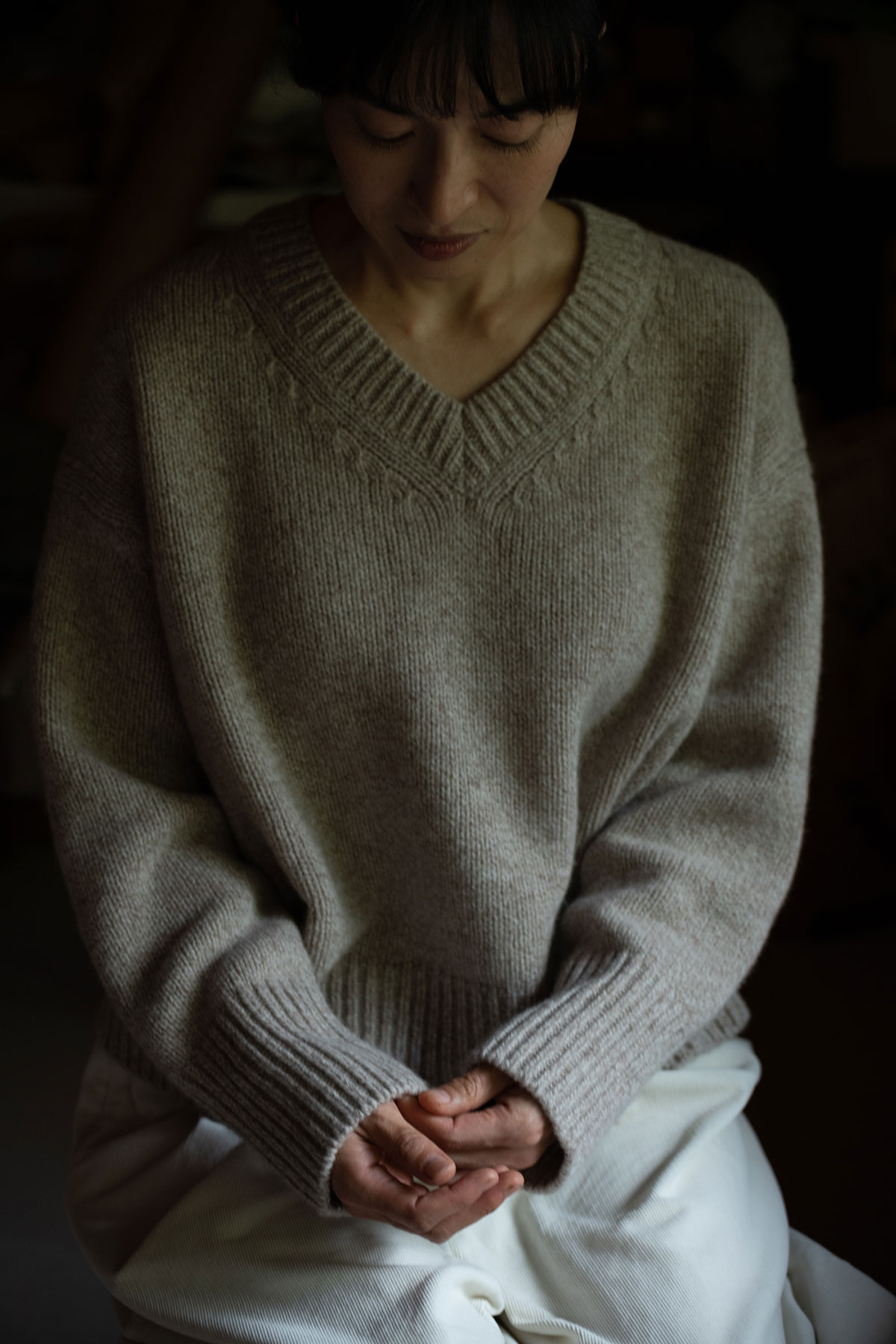 人の手がさまざまに介しているニットを、時代が移り変わっても廃ることのない普遍的なニットとするために、裾と袖口は同じリブで、首元は違うリブにするなど、シンプルでありながらもデイティールにこだわっている。このVネックの仕様は、ディレクター自身が店頭でお客さまとお話を交わした際にリクエストを受けたことで、ふたたびの提案が実現しました。