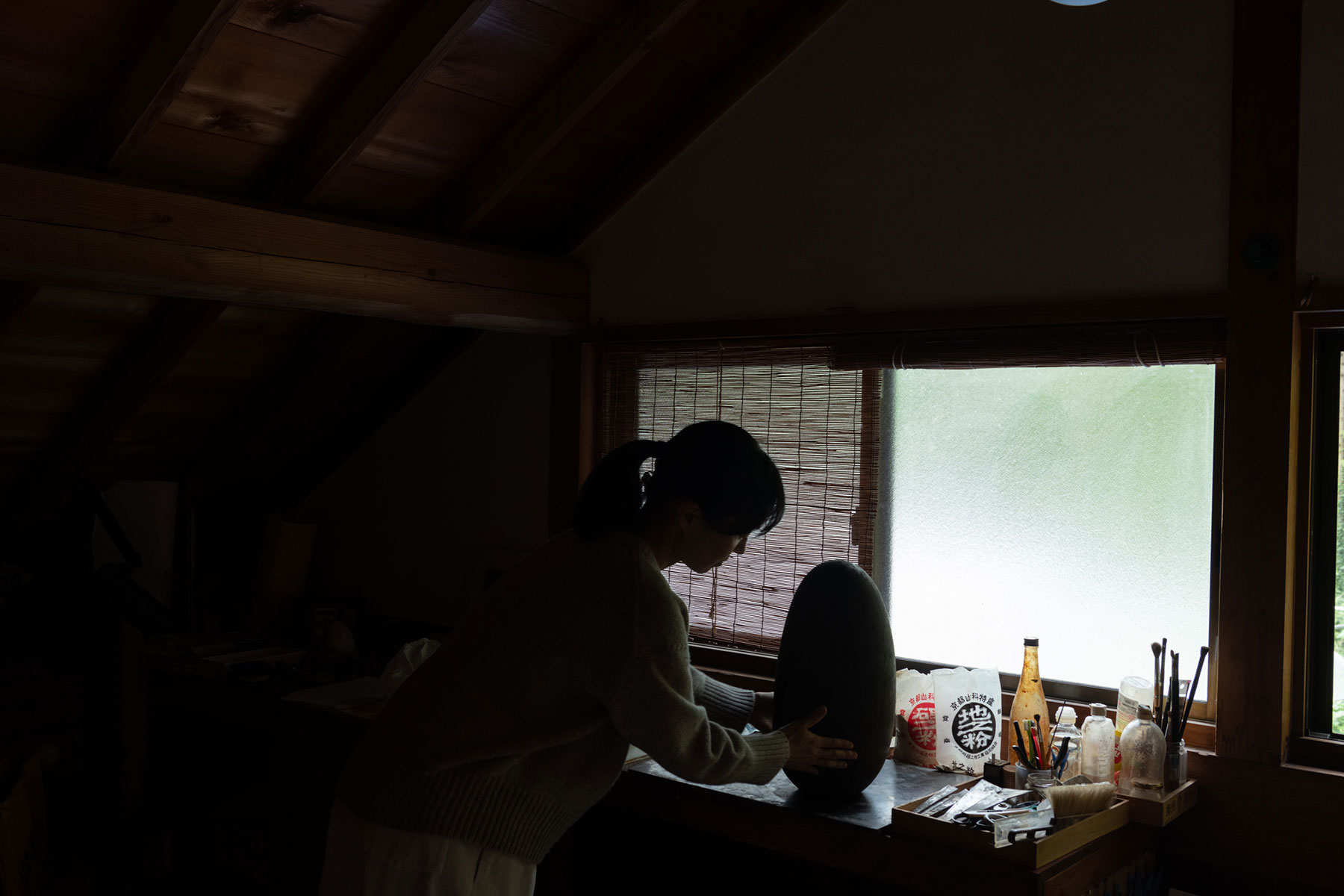 大西先生の工房で、小梛さんが学んだのは、単に「技法」であるだけではない。漆の一滴一滴を扱う手つき、まなざし、その姿、漆に注ぐ愛情を目の当たりにした。その情熱こそが、ひとりで制作を続けていくことにともなう孤独を支えてくれる、と知る。